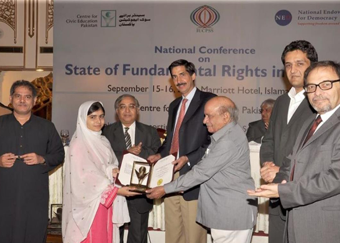 Centre for Civic Education and Inter University Consortium for Promotion of Social Sciences Pakistan jointly organized a National Conference on State of Fundamental Rights in Pakistan on11th October, 2014 in which Malala Yousafzai receiving Civic Courage Award.